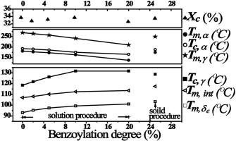 In order to improve the thermal stability of δe form of sPS that possesses nanoporous structure, benzoylation of the phenyl groups was adopted and performed by solution procedure or solid procedure. The solution procedure involves initial benzoylation of sPS in solution and then preparing δe form by solvent induction of benzoylated sPS; the solid procedure means benzoylation of δe form of sPS in solid state. Usual modifications of sPS by solution procedure greatly decrease the crystallinity of the nanoporous related δe form. In this work, sPS can well maintain its crystallinity of δe form after benzoylation by solution procedure, even when benzoylation degree reaches 20%. Thermally induced phase transition behaviors of corresponding δe form were investigated by Differential scanning calorimeter and temperature-dependent X-ray diffraction analysis. The results show that the δe–γ transition temperature increases after benzoylation by both two procedures, indicating improved thermal stability of δe form. The subsequent γ–α transition and the melting of α form both shift to lower transition temperature. Meanwhile, the transition of δe form to γ form was prohibited by solution procedure contrast to solid procedure.